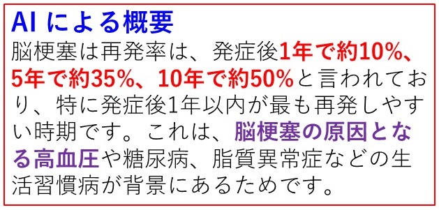 脳梗塞の再発率は、1年で10%、10年で50%、と言われています。