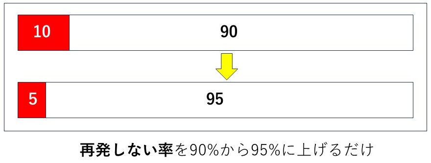 こんな簡単なことで再発率が半減したりするものか?と思われるでしょうが、再発しない率を90%から95%に上げるだけですから、十分に実現可能です。
