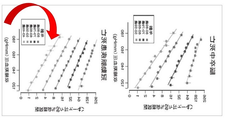 するとヨコ軸が死亡リスクでタテ軸が血圧になり、「死亡リスクが増える→血圧が上がる」となって、因果関係が逆に見えてきます。