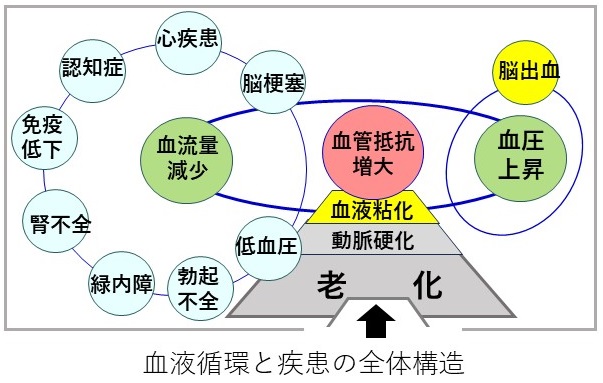血流量が減少すると、さまざまな病気が起きてきます。「血の巡り」こそが健康の基本だからです。脳梗塞は脳への血流量が不足して起き、心筋梗塞は心臓への血流量が不足して起き、慢性腎炎は腎臓への血流量が不足して起き、緑内障は網膜への血流量が減少して起き、勃起不全は陰茎への血流量が減少して起きています。これらの病気は血圧が上方したから起きているわけではありません。