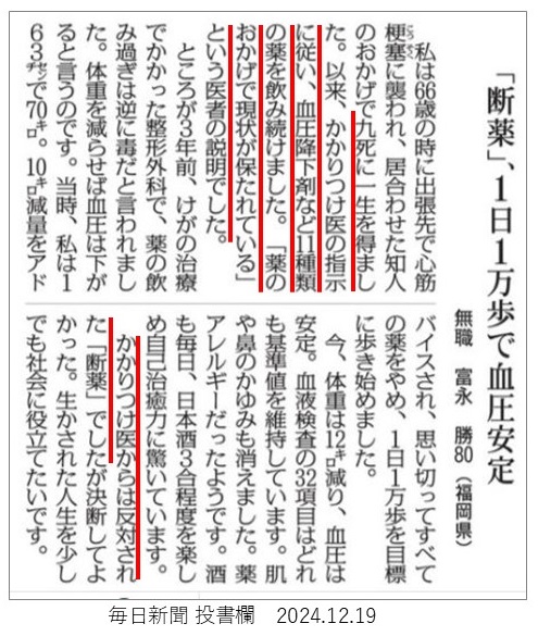 下は新聞投書です。富永さん(80才)は66才の時に心筋梗塞を起こし、その後、血圧降下剤など多くの薬を飲んでいました。しかし77才の時、薬をやめて生活習慣を改善しました。3年後の今、毎日酒3合はどうかと思いますが、とにかくお元気だそうです。
