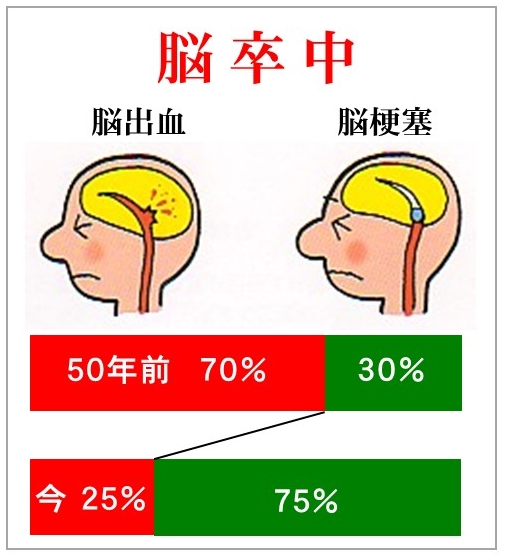 脳出血と脳梗塞を併せて脳卒中と呼んでいます。日本では50年前までは動物タンパク質の摂取量が少なくて血管が弱かったので、脳の血管が破れる脳出血が主でした。筆者の祖父も50年ほど前に、突然脳出血で亡くなりました。しかし最近は肉や卵や乳製品など、動物タンパクがたくさんとれるようおになって血管が丈夫になり、逆に血液中に脂質が増えてきて血管が詰まりやすくなり、脳卒中の4分の3が脳梗塞となっています。