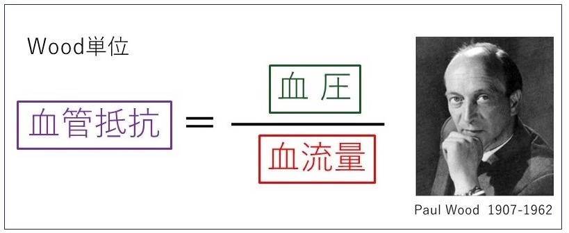 これは流体一般に成立する式で、中学の理科で習う、電流x抵抗=電圧というオームの法則と同じです。宗内医師も論文の題名にキャパシタンスとかインピーダンスなどと、電気用語を使っています。実際に肺高血圧の治療ではこの式で血管抵抗を計算していて、その考案者の医師の名をとって「ウッド単位」と呼ばれています。